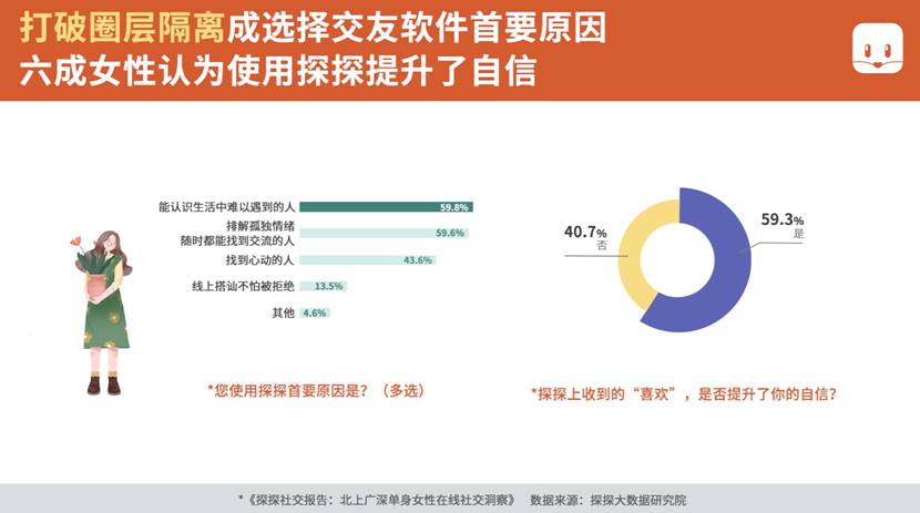 《探探社交報告:北上廣深單身女性在線社交洞察》(以下簡稱《報告》)顯示,交友軟件已成一線城市單身女性日常生活中的重要社交工具,除增加社交廣度、尋找戀愛機會外,41.9%受訪者曾利用探探結識過好友,且收入越高的女性,線上交友越主動。