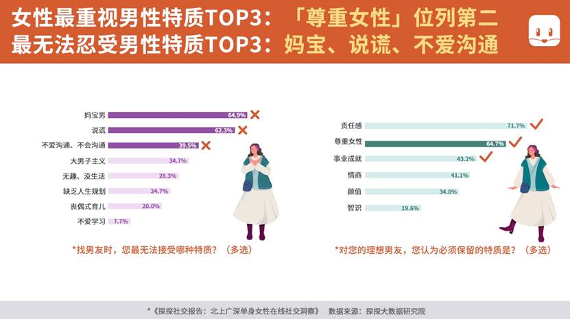 北上廣深女性對事業、自我價值的重視,也體現在了擇偶標準上。《報告》顯示,在選擇理想男友時,北上廣深單身女性最不愿放棄的男性特質TOP3包括:責任感、尊重女性、事業成就,而媽寶、說謊、不會溝通/不愛溝通,則位列最不受歡迎男性特質TOP3。
