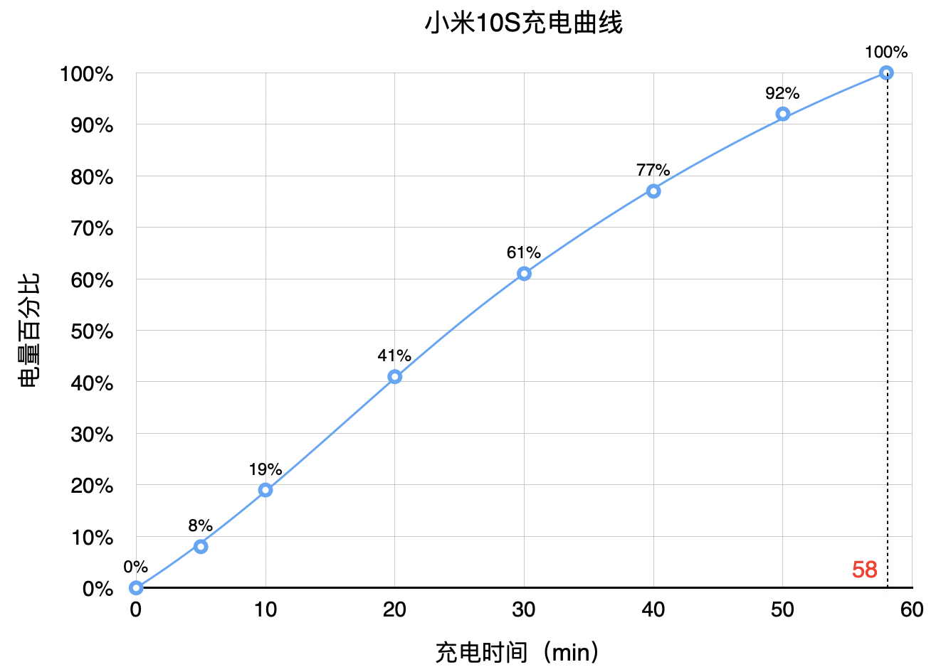 在充電速度方面,使用原裝充電器為小米10S充電,半小時即可充電61%,0-100%充電總耗時則需要58分鐘。