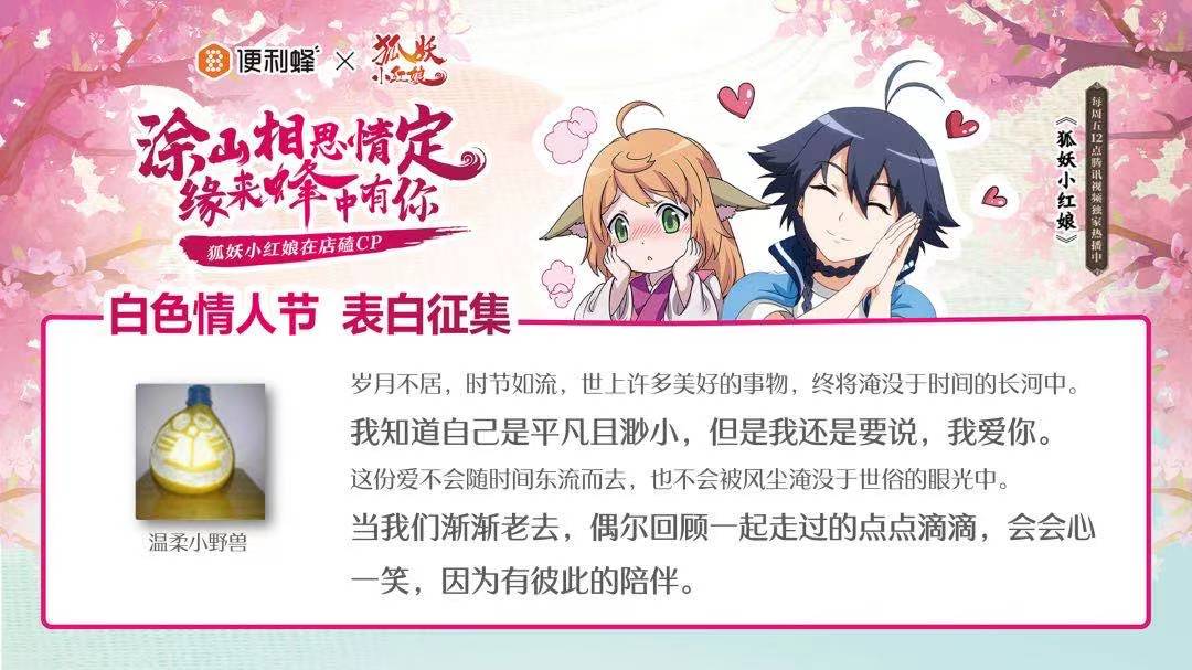 “《狐妖小紅娘》IP和我們想表達(dá)的內(nèi)容主旨非常契合。一方面,《狐妖小紅娘》本身的IP角色就是在‘牽紅線(xiàn)’,以不同的篇章表達(dá)各不相同的愛(ài)情觀(guān)。另一方面,3月14日前后,恰逢白色情人節(jié)。因此,我們希望通過(guò)這次的表白活動(dòng),與消費(fèi)者進(jìn)行‘情感連線(xiàn)’。”便利蜂方面介紹。