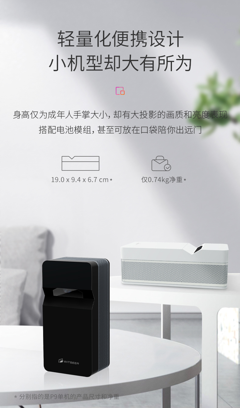 亮度和清晰度是超短焦/超近距智能投影最基礎(chǔ)、最影響消費者觀感體驗的性能,在此基礎(chǔ)上,還需要解決不少技術(shù)的問題,如便攜式投影的續(xù)航。行業(yè)內(nèi)有品牌給出了解決方案——模塊化。新品慧示P9創(chuàng)造性地加入了外置的鋰電池,使用方式類似手機上常見的磁吸式“外殼供電”,斷電情況下吸上去能夠供電兩個小時,基本能夠滿足外出開會、娛樂的攜帶需求。