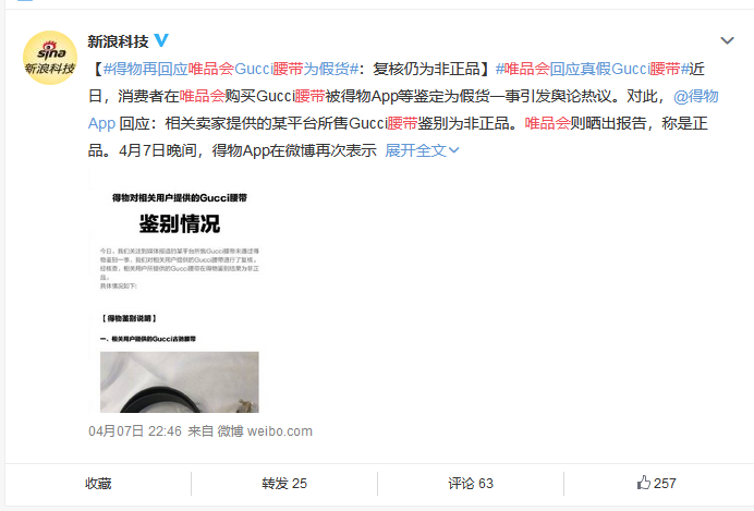 唯品會方面針對這一事件回應稱,售賣的商品保證為正品,該批Gucci腰帶由唯品會在海外直采,采買鏈路清晰可靠且合法合規,該批次貨品也由中國檢驗認證集團進行抽檢,已通過鑒定。
