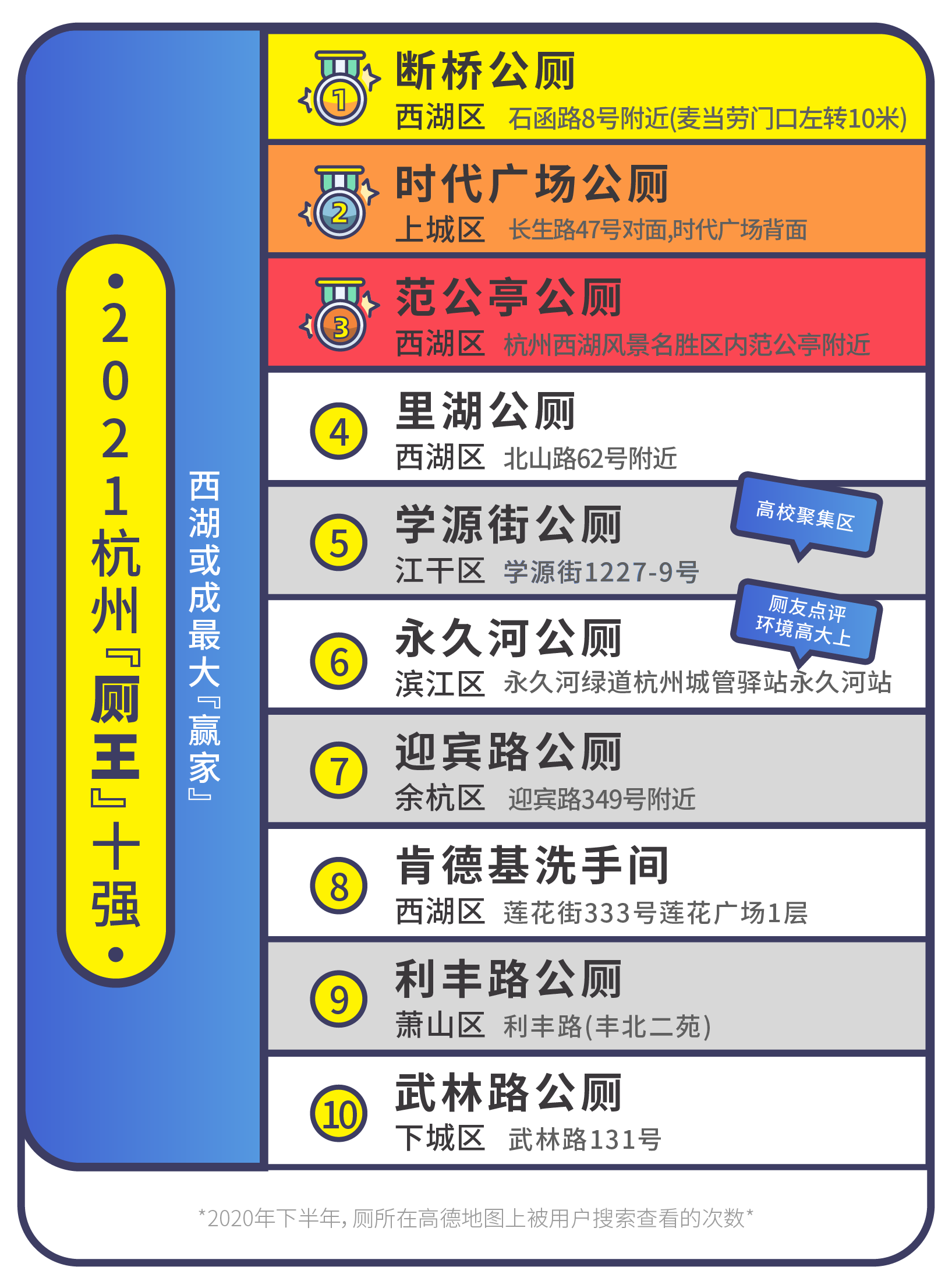 根據2020年下半年,各城市廁所在高德地圖上被用戶搜索查看的次數,圖鑒分別評出了十個城市的“十大廁王”。用戶通過高德地圖搜索公共廁所,多為身處陌生環境,且沒有直接發現廁所指示標識,“十大廁王”并不一定是城市中光顧人數最多的廁所,但是,在用戶想去廁所又找不著時,他們是為最多人救急的廁所。