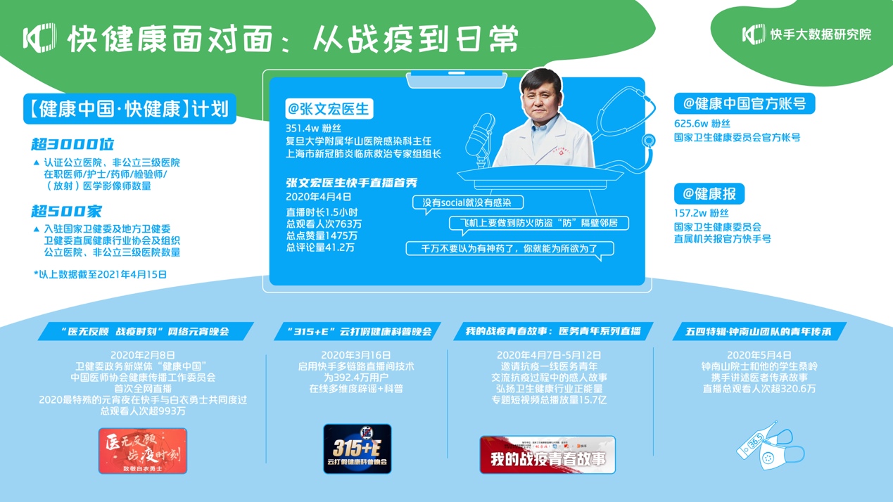 除此,眾多政務機構也在快手日常發布權威資訊和一線消息。以健康衛生機構為例,在新冠疫情期間,它們在健康科普和專業辟謠等方面作出突出貢獻。報告顯示,截至2021年4月15日,快手”健康中國·快健康”計劃共有超過500家國家衛健委及地方衛健委、衛健委直屬健康行業協會及組織、公立醫院和非公立三級醫院入駐;認證的公立醫院和非公立三級醫院在職醫師護士、藥師、檢驗師、(放射)醫學影像師數超3000位。