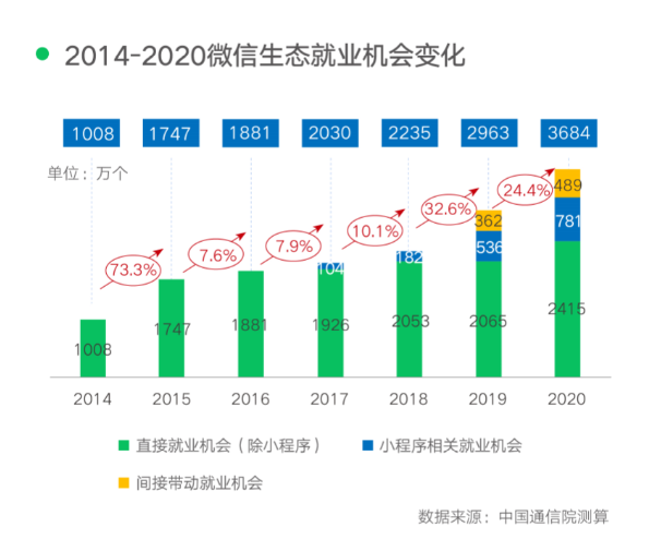 速途網4月22日訊(報道: 王璇)今日,中國信通院發布了基于微信平臺的《數字化就業新職業新崗位報告》。報告顯示,由公眾號、小程序、視頻號、微信支付、企業微信等共同構成的微信生態,在2020年衍生就業機會3684萬個,同比增長24.4%。自去年以來,微信生態以數字化能力催生新職業新工種新崗位,持續普惠中西部發展、降低就業門檻,為“穩崗拓崗、提質擴面”做出了積極貢獻。