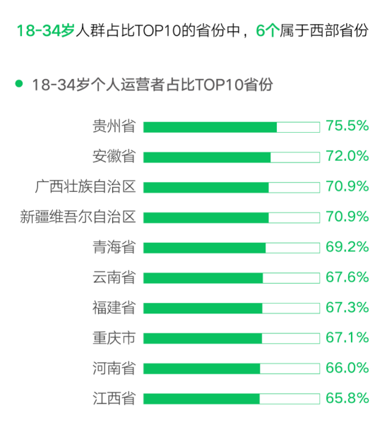 數字化發展突破地域限制、空間限制的優勢愈發凸顯,進一步向多區域協調發展邁進,中西部市場、下沉市場迎來新的發展機遇。中西部的成都、西安、重慶等都聚集了較多的小程序和公眾號運營者。18-34歲人群占比TOP10的省份中,6個屬于西部省份。