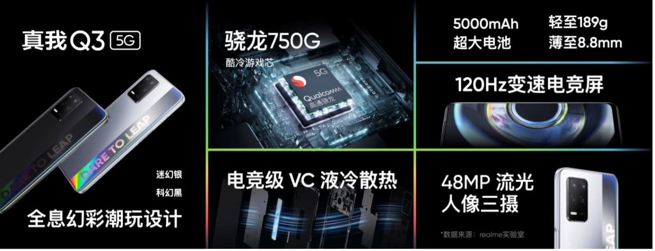 真我Q3搭載新一代高通5G芯片驍龍750G,其采用8nm制程工藝,Adreno 619?和第五代AIE構(gòu)架NPU搭配同級(jí)首個(gè)電競(jìng)級(jí)VC液冷散熱系統(tǒng),性能表現(xiàn)全面升級(jí)。