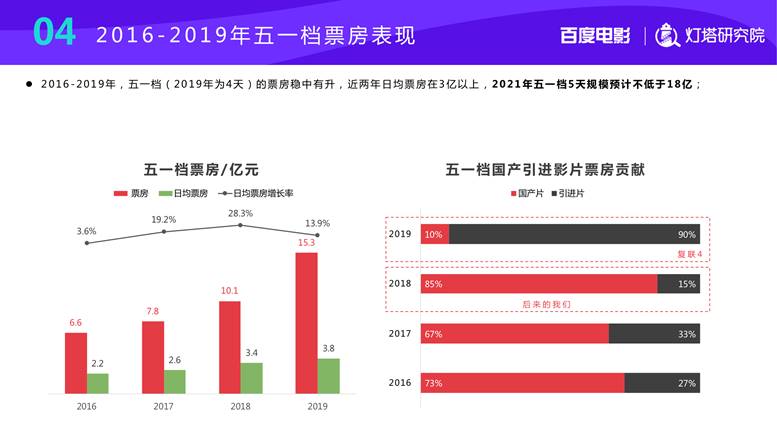 根據這份“中國電影市場趨勢分析報告”,近五年來,國產片越來越傾向于在大檔期上映,票房10億+國產片多集中于春節、暑期、國慶及賀歲四大檔期。而對于五一檔,近兩年日均票房在3億以上,處于穩中有升的態勢。報告也作出前瞻:2021年五一檔,5天票房規模預計不低于18億。