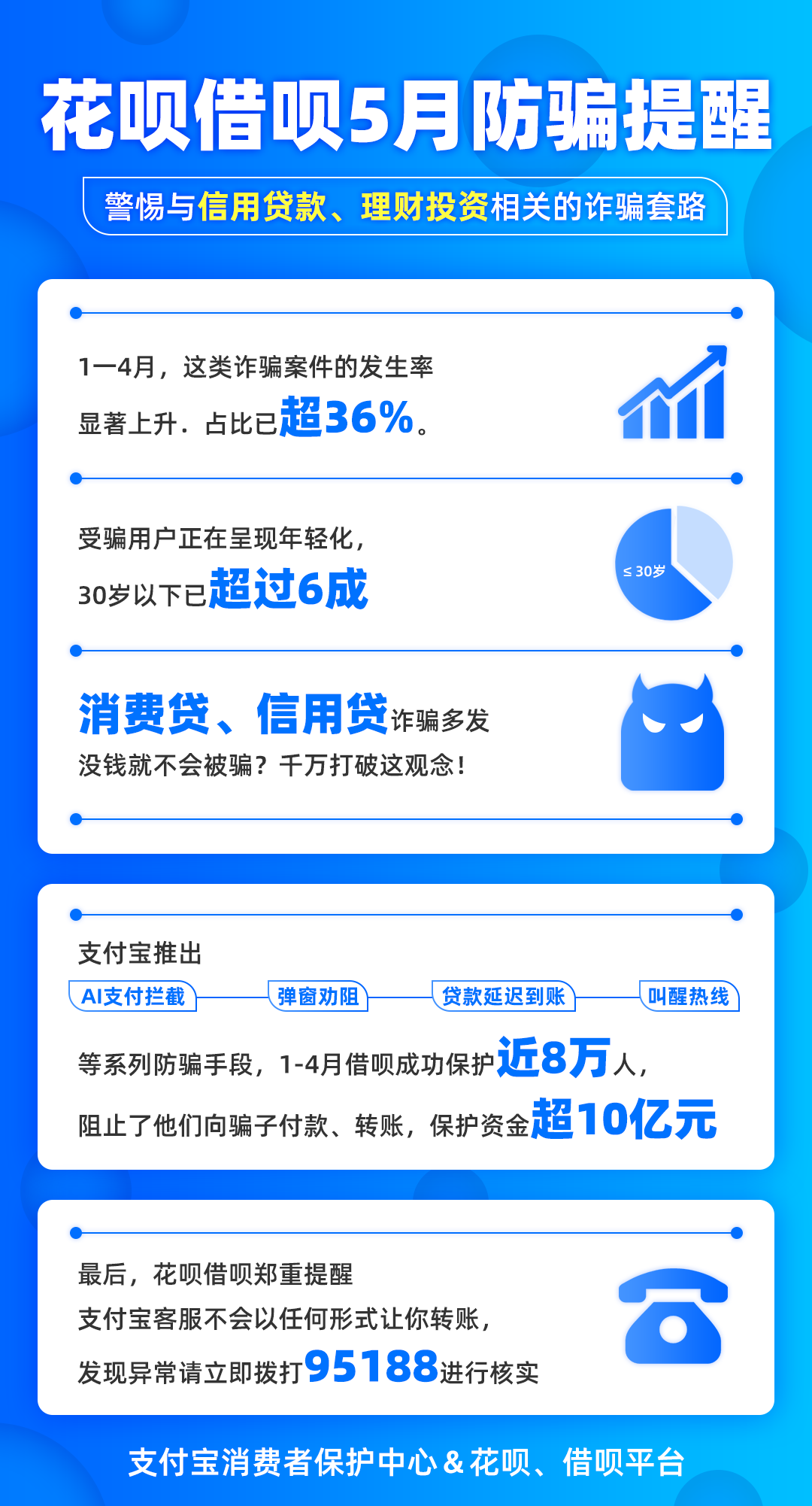 速途網(wǎng)5月11日消息(報(bào)道:李楠)今年以來(lái),成都、杭州、大連、深圳等多地警方集中公布詐騙高發(fā)類型,其中信貸投資類案件占比顯著上升。一類是騙子制造虛假網(wǎng)貸App詐騙;另一大類是以高收益投資為誘惑,誘騙用戶在正規(guī)信貸平臺(tái)貸款進(jìn)行投資。5月11日,支付寶消費(fèi)者權(quán)益保護(hù)中心聯(lián)合花唄、借唄發(fā)布5月防騙提醒。花唄借唄平臺(tái)數(shù)據(jù)顯示也印證了以上趨勢(shì)。