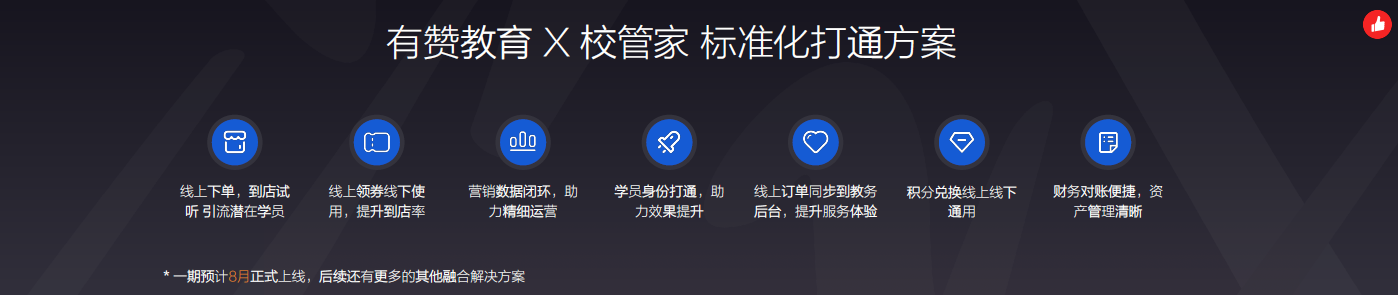 接下來,有贊教育和校管家即將落地的標準化打通方案將包含7大場景:潛在學員在線報名;線上領券線下使用;線上、線下學員身份打通;線上、線下學習數據打通;線上訂單同步教務后臺;學員積分數據打通;支付數據打通。一期打通方案預計8月正式上線,后續還將推出其他融合解決方案。