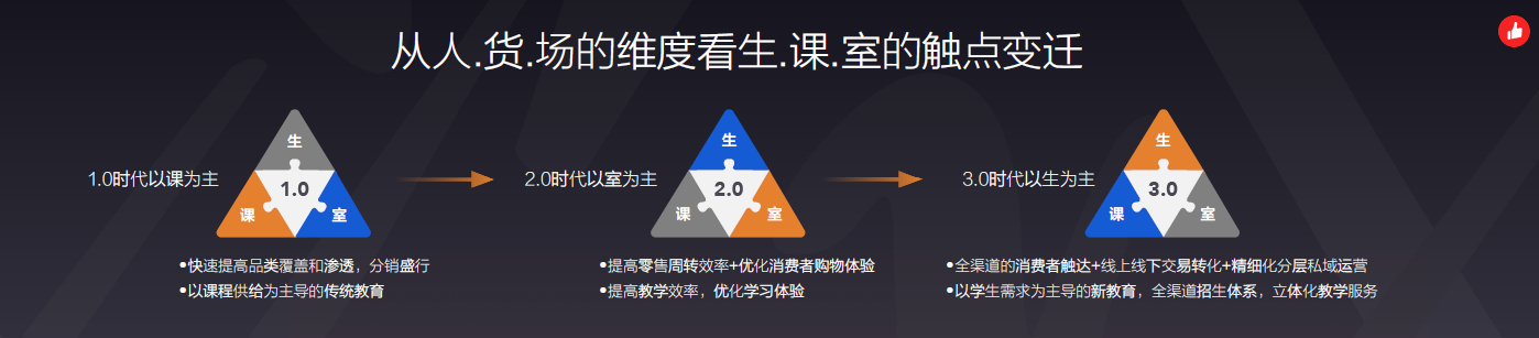 浣昉表示,從私域經濟人、貨、場的維度,有贊看到了教培行業生、課、室的觸點變遷。其把教培行業的變遷分為3個階段:以課程為主的傳統教育時代;以教學場景-教室為主的2.0時代,諸如在線教育的、雙師課堂的崛起都是圍繞著“教室”運營效率的提高而產生的;以學生為核心的新教育3.0時代,關鍵在以學生需求為核心來展開精細化私域運營,滿足學員學習旅程的各種需求。