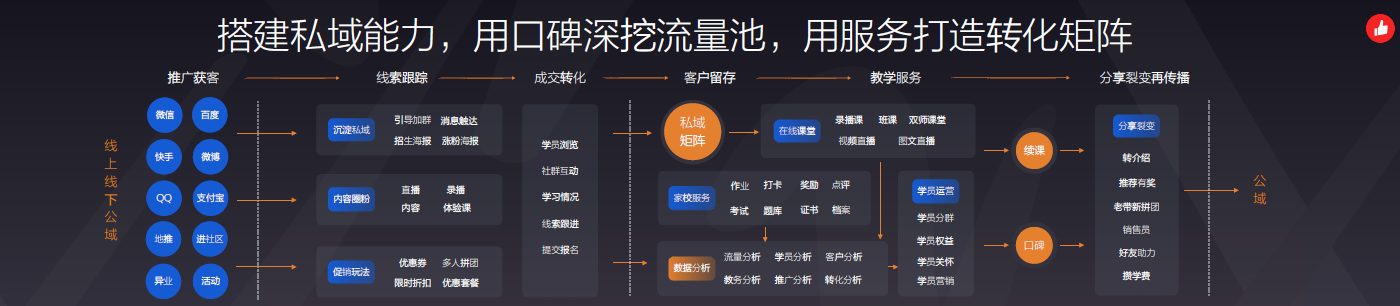 關于如何搭建私域能力,有贊給到了三點核心建議:首先,要做線下線上全渠道的經營;其次是利用線上線下的融合,做好教學服務,通過口碑提升單客價值;最后,積累客戶和學員的行為數據標簽和畫像,進行精細化的分層運營,為學員整個學習旅程提供價值。這三點是做好私域運營的基礎。