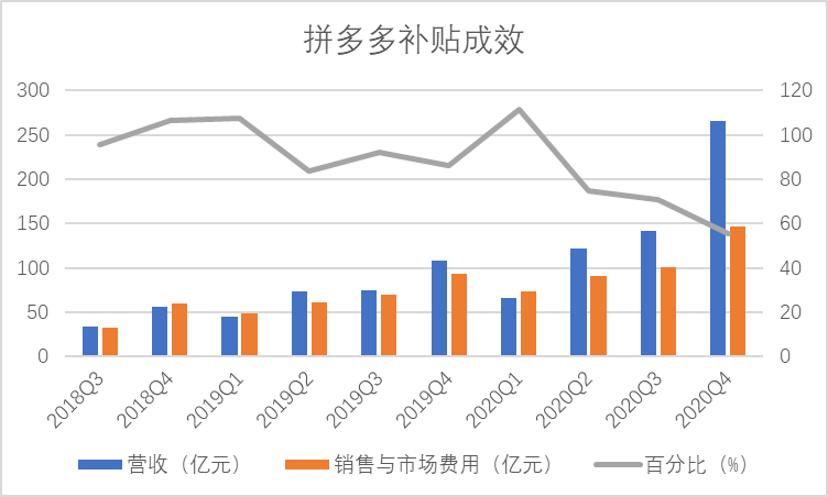 “下一季度會繼續(xù)‘百億補貼’戰(zhàn)略”,拼多多創(chuàng)始人黃崢在2019年第三季度財報電話會議的表態(tài)打消了投資者以及消費者的顧慮。而后我們看到了,百億補貼開始為拼多多帶來越來越多的營收,其在2020年Q3才首次單季超過100億元,并在2020年第四季度將其在營收的占比降至55.4%。這說明,“百億補貼”戰(zhàn)略確實為拼多多的增長注入了強勁動力,在講究ROI的時代,百億補貼詮釋了投入的高效。