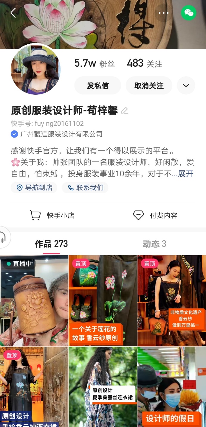 傳統蠟染袍子、香云紗、真絲、手工繡花連衣裙……靠著對原創的堅持和服裝的高性價比,加之快手濃厚的電商氛圍,茍梓馨成功在快手潮搭領域脫穎而出。