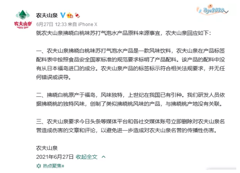 2021年6月27日,有網(wǎng)友透過微博公開對農(nóng)夫山泉進(jìn)行質(zhì)疑,“農(nóng)夫山泉拂曉白桃味蘇打氣泡水產(chǎn)品在其營銷文案中提到,拂曉白桃產(chǎn)自日本福島縣。”此外,該網(wǎng)友犀利評論稱,農(nóng)夫山泉拿福島水果當(dāng)噱頭,等于告訴大家“有點(diǎn)甜”變成“有點(diǎn)毒”。