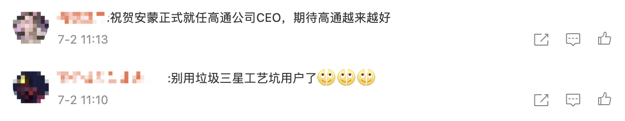 雖然芯片業務取得了大幅增長,但高通近年來推出的芯片產品,卻并沒能獲得消費者的一致認可。在安蒙就任高通CEO的微博下,一部分用戶表示對于安蒙履新的祝賀,但也有一部分用戶發表了對于高通產品的不滿。例如存在產品技術力“擠牙膏”、采用三星工藝太“坑”等。
