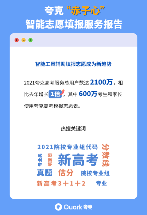 選志愿的專業程度和門檻提高、輔助填報市場規模快速增長、個性化需求爆發,夸克APP產品負責人鄭嗣壽這樣總結今年的高考需求洞察。而連續第三年推出高考智能信息服務,夸克基于百萬級高考大數據,以簡單、合理的智能志愿工具,幫助考生提高決策效率,提升報考信息的透明度,降低填報志愿的門檻。