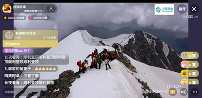 “搜狐新聞雪山行”嘗試用“主直播+原生態直播+慢直播”打出“組合拳”。其中“主直播”由搜狐官方賬號播出,搜狐視頻自媒體賬號“搜狐新聞”實時直播七彩瀑布出發至大本營、高原訓練、行進C1,直至登頂的過程,串聯了整個故事主線。
