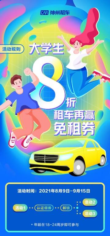 根據神州租車APP頁面介紹顯示,8月9日至9月15日活動期間,年齡在18-24周歲的用戶可登錄神州租車APP完成注冊及信息認證,可限量領取大學生特權“8折券”。認證之后,可解鎖“租2免1”、“每滿1000元返8折券”等優惠活動。本次活動的優惠券適用于全國各直營城市門店。另外,如為新注冊的用戶,還可獲得120元新人代金券。