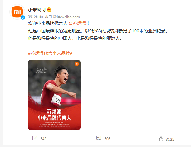剛剛,小米公司透過其官方宣布了亞洲百米紀錄保持者、中國田徑運動員蘇炳添正式出任小米品牌代言人的消息。