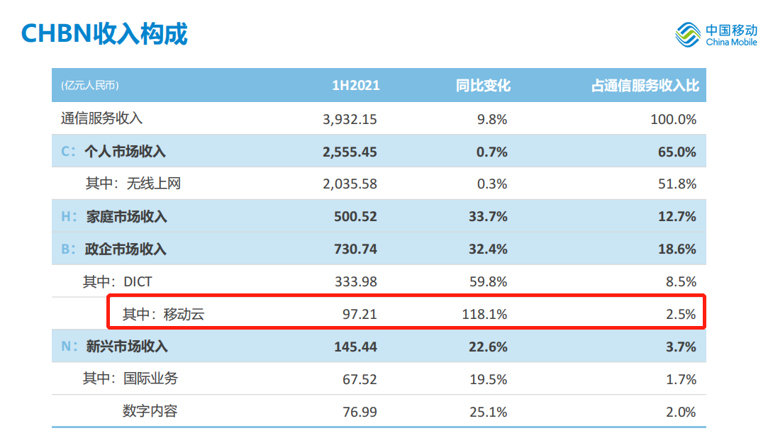 政企市場動能強(qiáng)勁,DICT 收入達(dá)人民幣 334 億元,同比增長 59.8%。其中,移動云收入達(dá)人民幣 97.21 億元,同比增長 118.1%,超2020年全年營收,且公有云收入份額進(jìn)入業(yè)界前十行列,再次跑出加速度。