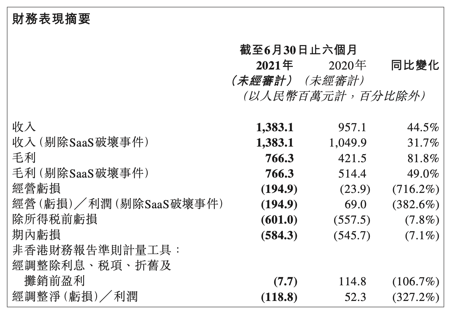 速途網8月16日訊(報道:何煦)今日,微盟集團公布2021年上半年業(yè)績。財報顯示,2021年上半年微盟集團營收13.83億元,較2020年上半年同期增長44.5%,毛利7.66億元同比增長81.8%。經營虧損為1.949億元,相較去年0.239億元虧損幅度擴大716.2%。經調整后凈虧損為1.188億元,相交去年同期凈利潤0.523億元,虧損同比變化為-327.2%。