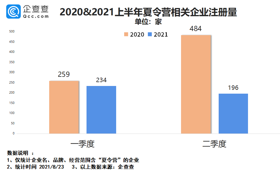 從今年的注冊量來看,企查查數據顯示,2021年上半年,我國夏令營企業注冊量為430家,同比下跌了42.1%。從各季度注冊量來看,今年一季度注冊量為234家,二季度的注冊量為196家,均呈同比下跌趨勢。