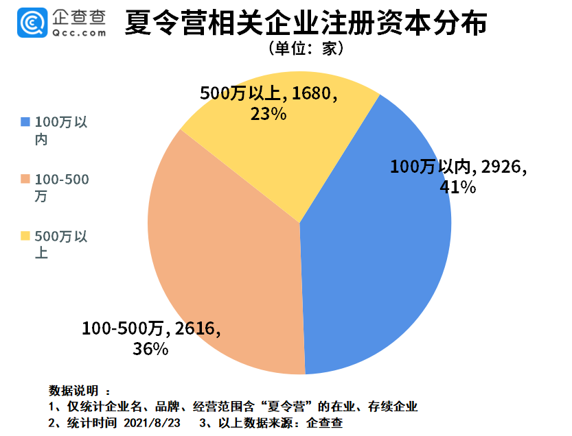 從注冊資本分布來看,企查查數據顯示,目前我國現存的夏令營相關企業注冊資本主要集中在500萬以內,其中注冊資本在100萬以內的企業占比41%;100-500萬之前的占比36%;500萬以上的僅占比23%。