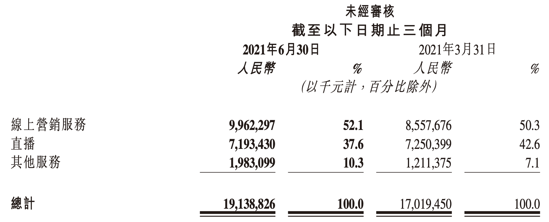 而在超預期的增長背后,快手整體的營收組成也發生了更為深層次的變化,線上營銷及電商收入均以高于100%的速度增長。其中,線上營銷服務較去年同期的39億元勁增156.2%至99.6億元,以52.1%的總收入占比,位列快手第一大收入來源。