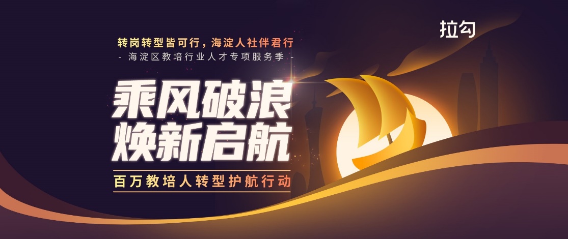 “雙減”政策落地,教培行業(yè)迎來變局,各大 K12 教育公司業(yè)務(wù)縮減,數(shù)百萬教培行業(yè)從業(yè)者迎來了”轉(zhuǎn)行潮”。為幫助教培行業(yè)從業(yè)者順利轉(zhuǎn)型,北京市海淀區(qū)人社局號召經(jīng)營性人力資源服務(wù)機(jī)構(gòu)全力做好教培人才的就業(yè)服務(wù)保障工作,開展”海淀區(qū)教培行業(yè)人才專項服務(wù)季”活動。作為本次服務(wù)季的重要參與者與行動派,拉勾招聘于 9 月 6 日開啟“乘風(fēng)破浪 煥新啟航——百萬教培人轉(zhuǎn)型護(hù)航行動”。