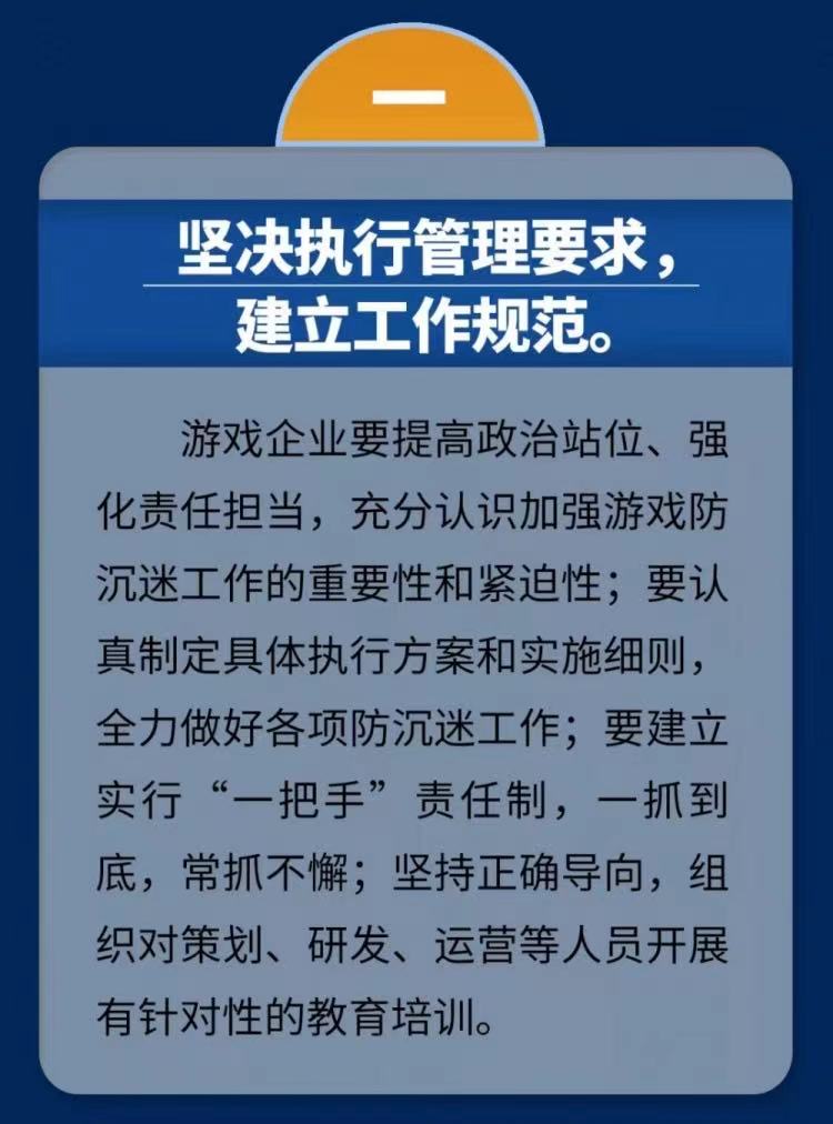 4、堅決夯實平臺管理,明確具體要求。游戲企業(yè)必須建立健全游戲運營平臺的管理機制,其中游戲廣告平臺不得推送違法違規(guī)游戲內(nèi)容、不得向用戶強制推送游戲廣告;游戲直播平臺不得設(shè)置高額打賞、未成年人打賞功能;游戲電商平臺不得以任何形式向未成年人提供賬號租賃交易服務(wù);游戲陪練平臺要集中清理違法違規(guī)信息和賬號,不得向未成年人提供陪玩、代練等服務(wù)。