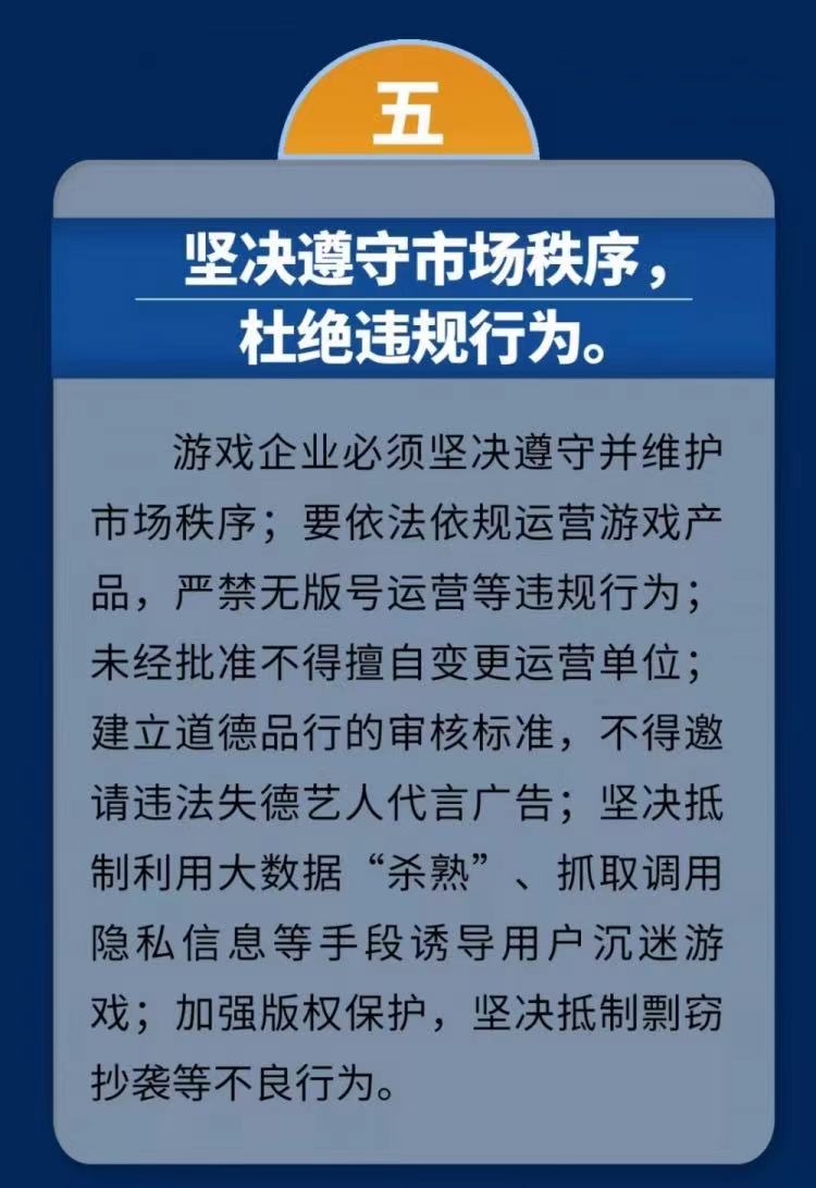 5、堅決遵守市場秩序,杜絕違規(guī)行為。游戲企業(yè)必須堅決遵守并維護市場秩序;要依法依規(guī)運營游戲產(chǎn)品,嚴(yán)禁無版號運營等違規(guī)行為;未經(jīng)批準(zhǔn)不得擅自變更運營單位;建立道德品行的審核標(biāo)準(zhǔn),不得邀請違法失德藝人代言廣告;堅決抵制利用大數(shù)據(jù)“殺熟”、抓取調(diào)用隱私信息等手段誘導(dǎo)用戶沉迷游戲;加強版權(quán)保護,堅決抵制剽竊抄襲等不良行為。