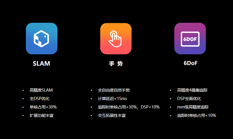 高精度SLAM算法可以實現全DSP優化,單核占用小于30%;自然手勢算法計算延遲低于15ms,追蹤時單核占用小于30%,DSP小于10%;基于CV追蹤的6DoF手柄算法全面優化了DSP,可以實現毫米級高精度追蹤,追蹤時單核占用低于10%。