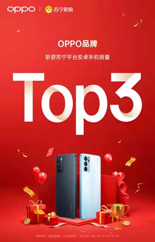 OPPO品牌斬獲蘇寧平臺安卓手機銷量TOP3。