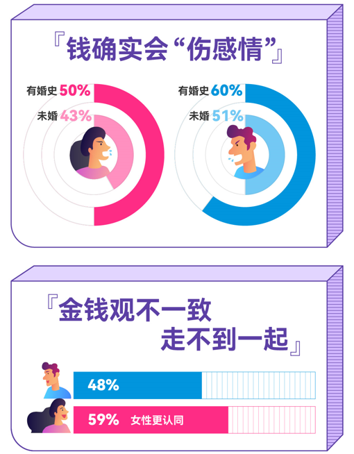 值得注意的是,“談錢傷感情”在離異群體更能體現出來。有婚史的男性以60%的比例,遠超未婚男性的51%,而有婚史的女性也以50%,超過未婚女性群體的43%。