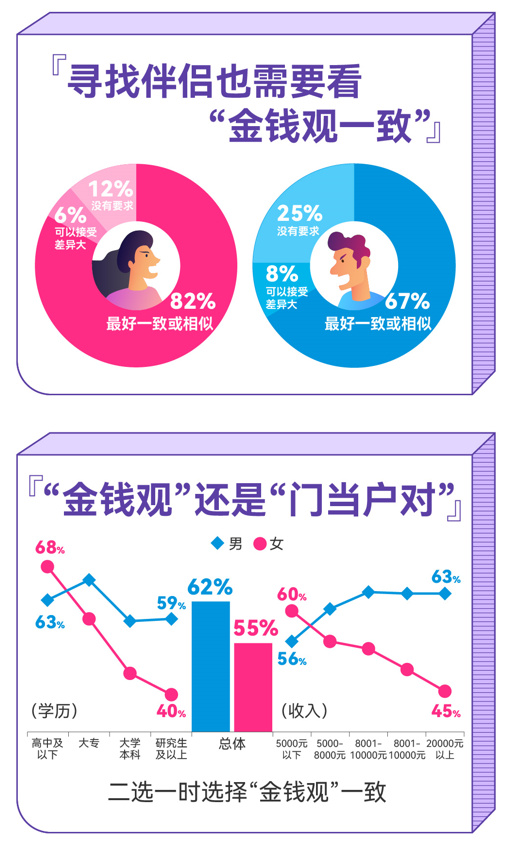 這也致使是否擁有一致的金錢觀,成為尋找伴侶的重要標準?!秷蟾妗凤@示,82%的女性和67%的男性尋找伴侶時,認為需要擁有一致或者相似的金錢觀。與此同時,隨著年齡、學歷以及戀愛經歷的增長,單身們對于戀愛需要一致金錢觀的認同程度越來越高。