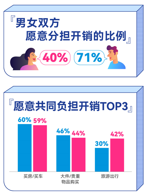 即便如此,男性仍然會選擇主動付出更多。調研顯示,男性更愿意主動承擔起經濟的職責,愿意分擔的比例高達71%,女性則為40%。