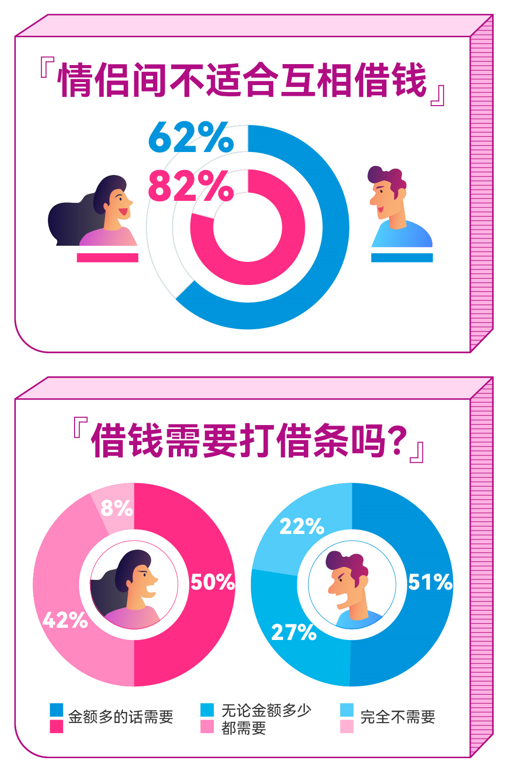 借錢不一定傷感情,但借錢不還則容易有矛盾。調研數據顯示,高達62%的男性和82%的女性都認為,戀人間不適合相互借錢。