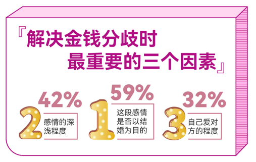 經濟分歧無法完全避免,感情仍然是關系支撐的基礎。59%的單身人群會判斷這段感情是否以結婚為目的,作為解決經濟分歧最關鍵的考量因素;其次,感情深淺程度和自己愛對方程度也是重要的考量因素,占比分別達到42%、32%。
