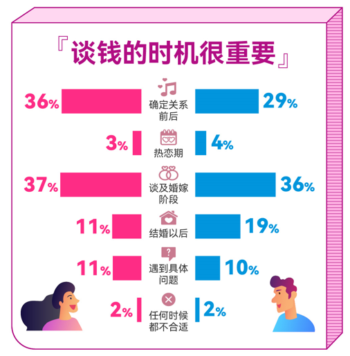 談錢是需要看時機、講技巧,男女性一致認為有最重要的兩個“節點”。《報告》顯示,情侶間應該在交往的哪個階段明確金錢關系,有29%的男性與36%的女性認為在“確定關系前后”為最佳;36%的男性與37%的女性則認為,應該是在“談及婚嫁階段”。