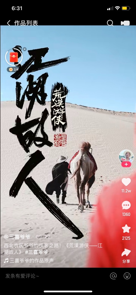 大漠孤煙,赤日炎炎,一位俠客仗劍而來,臉龐冷峻,著一襲戰(zhàn)袍,牽一匹駱駝,背影蒼涼。而在視頻的上一秒,這位俠客還是在玉米地里侍弄莊稼的尋常老人,白色汗衫配西瓜紅背心,戴頂草帽,佝僂著身軀,一回頭,沖兒子的鏡頭憨厚地笑。