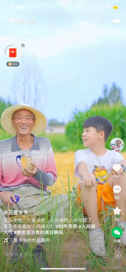 當然,他們最想呈現(xiàn)的,是幾十年來,家鄉(xiāng)所發(fā)生的翻天覆地的變化。國慶節(jié)的第二天,三喜爺爺更新了他的短視頻,他扮演了建國七十二年來不同階段的農(nóng)民形象。從彎腰駝背、愁容滿面的農(nóng)民,到挺直腰桿、扛著鋤頭的農(nóng)民,再到他穿著那件標志性的西瓜紅背心,最后,是三喜爺爺頭戴鴨舌帽、身著衛(wèi)衣牛仔褲的摩登形象,他的臉上,依然掛著最熟悉樸實的笑容。