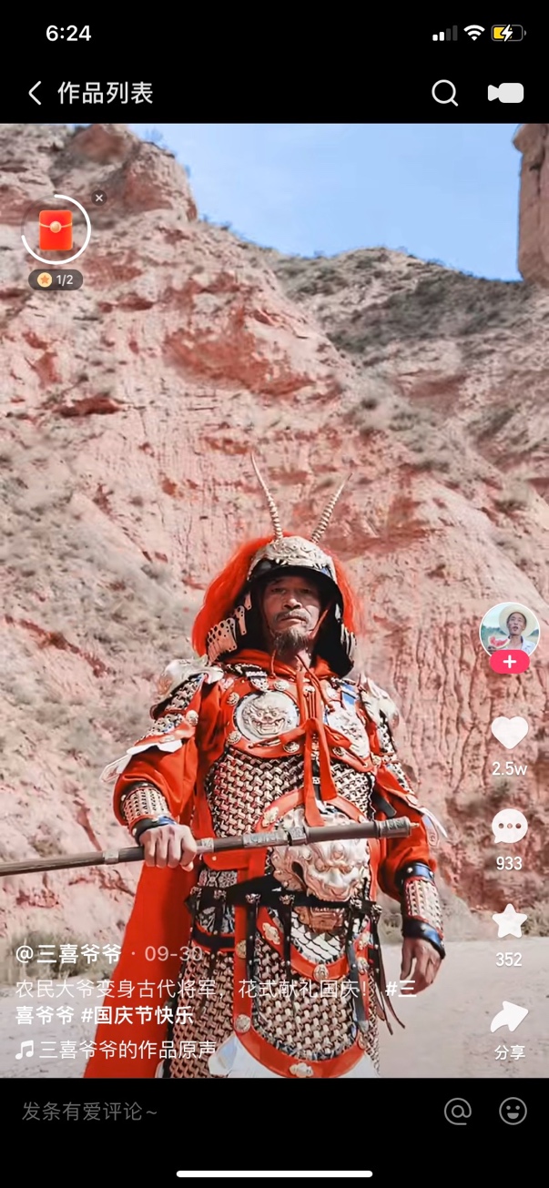 這位老人更為人熟知的名字是“三喜爺爺”,今年65歲的他7月份開始在快手短視頻平臺分享自己的生活,短短幾個月的時間,就收獲了十幾萬粉絲的關注,以及上百萬個點贊。最開始,三喜爺爺?shù)囊曨l展現(xiàn)的是他和外孫們在田間地頭、陣陣稻香中嬉戲玩樂的天倫之樂;而后,他逐漸發(fā)布了一系列換裝視頻,時而化身上海外灘西裝革履的老克臘,時而變?yōu)槊駠甏娧b筆挺的西北軍閥。荒漠俠客那條視頻下,有網(wǎng)友留言問:“大俠您還缺小弟嗎?”三喜爺爺秒回:“缺。”