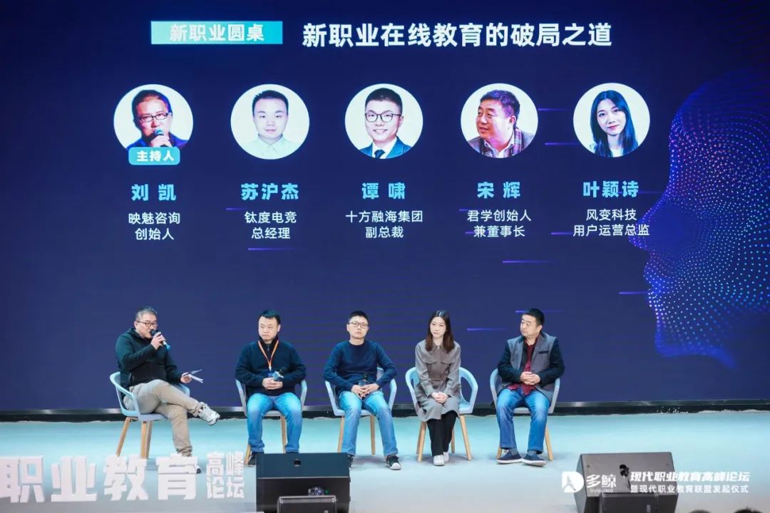 主題演講之后,是新職業教育圓桌論壇。在映魅咨詢創始人劉凱的主持下,鈦度電競總經理蘇滬杰、十方融海集團副總裁譚嘯、君學創始人兼董事長宋輝、風變科技用戶運營總監葉穎詩,圍繞《新職業在線教育的破局之道》這一話題,展開討論。