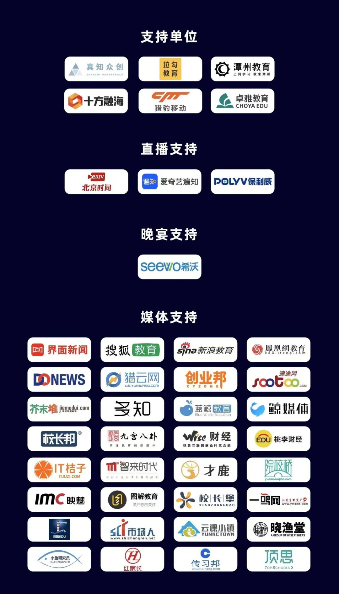 至此,活動圓滿落幕。感謝支持單位:真知眾創、拉勾教育、潭州教育、十方融海、獵豹移動、卓雅教育。感謝直播支持單位:保利威、愛奇藝遍知、北京時間。感謝晚宴支持:希沃。