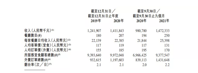 近年來,七欣天來自餐廳運營以及外賣的收入同時開啟了連年增長。招股書顯示:2019年、2020年以及截至9月30日的2021年前9個月(即“2021年前三季度”),七欣天來自餐廳運營以及外賣的收入分別為12.42億元、14.12億元以及14.72億元。權(quán)益股東應(yīng)占凈利潤分別為8190.5萬元、1.72億元、2.59億元。