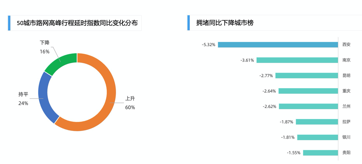 在市內道路方面,同比2020年,2021年全國50個主要城市中有60%的城市內路網高峰行程延時指數上升,24%的城市基本持平,16%的城市擁堵下降。擁堵下降城市中西安的降幅最大,其次是南京、昆明、重慶、蘭州、拉薩、銀川、貴陽。