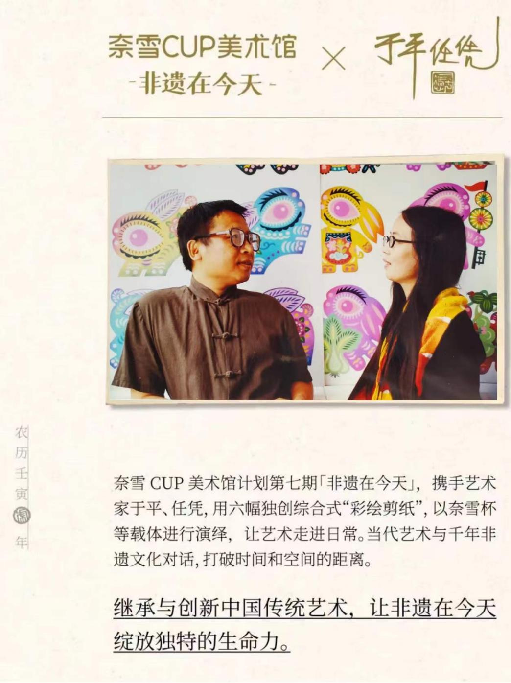記者了解到,”CUP美術館“是奈雪的茶推出的系列藝術項目,以與藝術家合作的方式在茶飲杯上呈現不同主題的藝術展。此次的「非遺在今天」,則是由奈雪牽手于平(男)、任憑(女)夫妻彩繪剪紙藝術家聯袂呈現。 兩位藝術家既是非遺剪紙藝術家也是民間傳統文化的深研者,他們在傳統剪紙藝術基礎上進行創新,將傳統民間剪紙藝術融合當代藝術觀念,糅合拼貼、墊色、渲染、拓印、肌理、噴繪、水洗等技法,獨創了綜合式“彩繪剪紙”品類。這一對夫妻彩繪剪紙藝術家曾出版圖畫書及畫集50余本,是中國郵政及中國郵政儲蓄銀行生肖郵品設計者之一,多幅作品被中國民間博物館,首都博物館,北京工藝美術博物館等機構收藏。