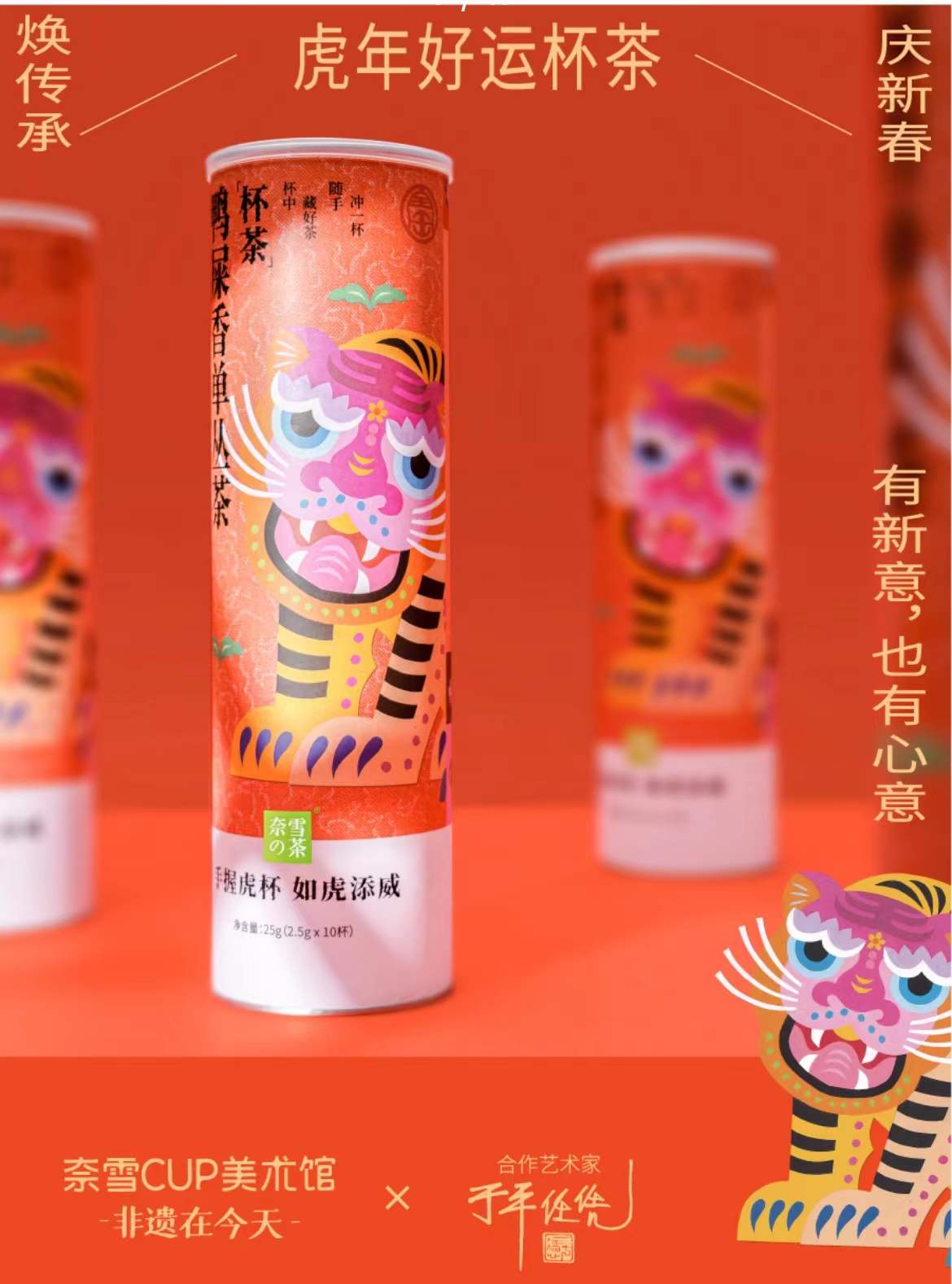 杯茶此前偶見于少數傳統茶業,多應用于較嚴肅的辦公、會議場景。奈雪敏銳發現年輕用戶對純茶的喜愛以及對飲茶方式的便利性需求,精準切入新年社交場景。“人手一杯茶,待客不麻煩”免去了洗杯、放茶等步驟,把更多時間留給親友交談;“虎杯握在手,新年氛圍有”,不同于商務用茶的刻板,奈雪杯茶沿用CUP美術館「非遺在今天」的虎杯設計,喜慶討巧非常適合作為年貨置辦;新春首款杯茶精選了去年上市即成爆品的鴨屎香,頗有誠意,同樣適合作為走親訪友的新春賀禮。