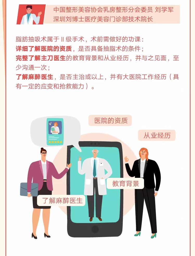 在美體塑形實操環(huán)節(jié),劉學軍提示消費者需在術前需做好的功課,詳細了解醫(yī)院、醫(yī)生資質,尤其應與麻醉醫(yī)生進行溝通,以保障吸脂手術安全進行。